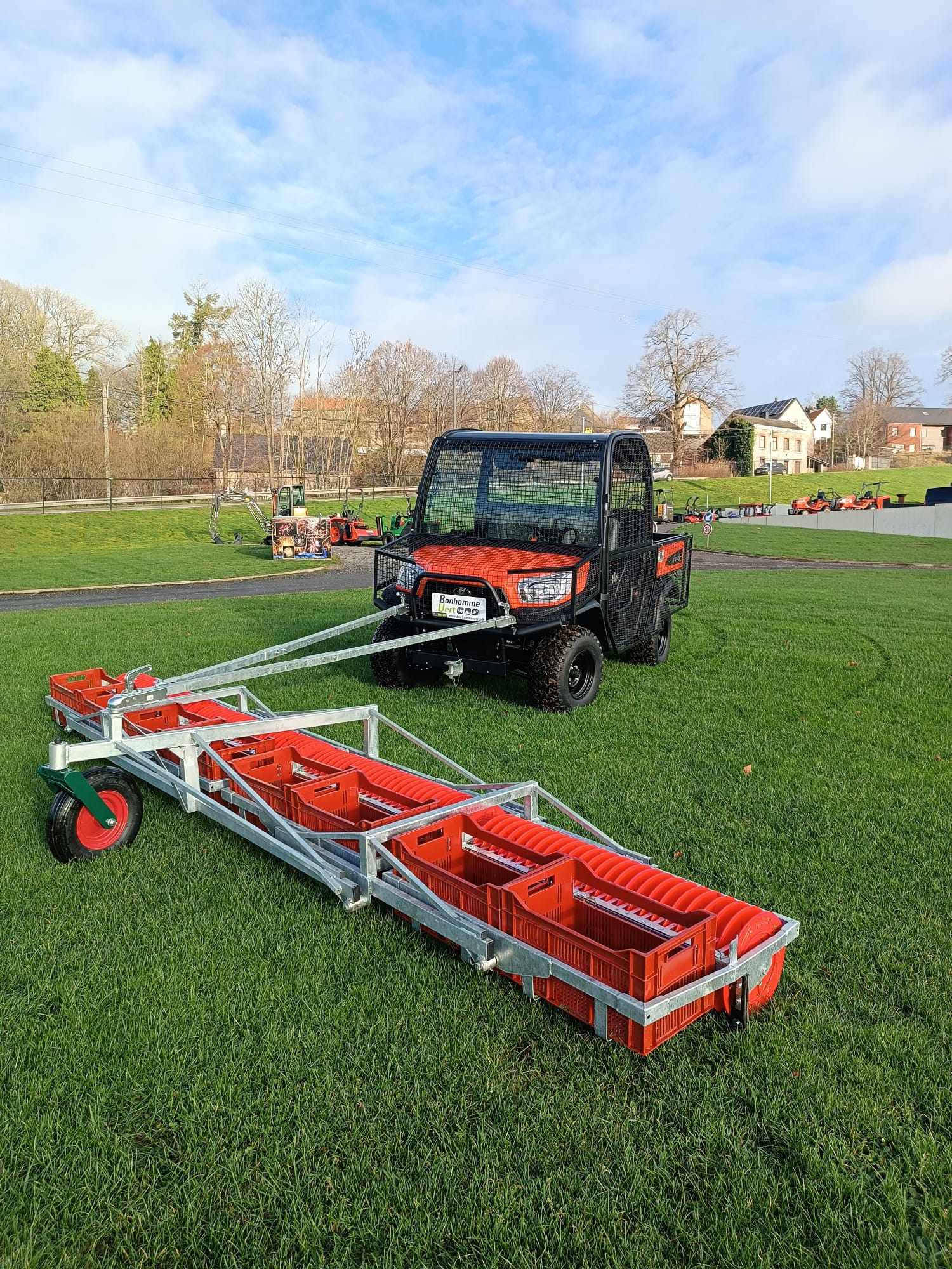 Pour ces derniers, nous avons développé en interne, chez Bonhomme Vert, un grillage de protection intégral. Ce dispositif protège le véhicule ainsi que le conducteur d’éventuels impacts de balles. Le RTV peut également être équipé d’un récupérateur de balles de golf.